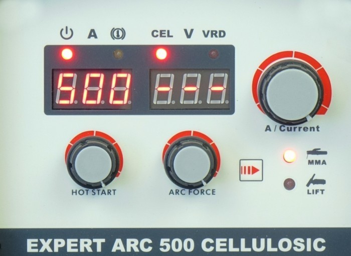 EXPERT ARC 500 CELLULOSIC MMA/TIG jest spawarką inwertorową do spawania metodą MMA elektrodą otuloną prądem stałym (DC) oraz metodą TIG prądem stałym (DC) z dotykowym zajarzeniem łuku. Umożliwia spawanie elektrodami rutylowymi, zasadowymi, cellulozowymi, do stali nierdzewnej i żeliwa. Sterowana elektronicznie, płynna regulacja prądu spawania.