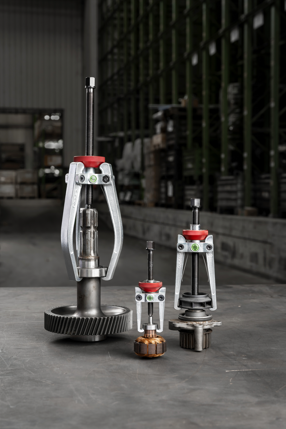 2-ramienny ściągacz z knurem stożkowym został opracowany w celu właściwego demontażu łożysk tocznych we współpracy ze skandynawskim producentem łożysk kulkowych. Zarówno proporcje ściągacza, jak i równomiernie proste ramiona ściągacza są specjalnie dostosowane do wymagań centralnego ściągania małych i średnich łożysk przy ograniczonych warunkach otoczenia. Dzięki temu zapobiega się możliwym uszkodzeniom łożyska i gniazda łożyska podczas demontażu. Sprężyny gwarantują synchroniczne otwieranie i zamykanie ramion ściągacza, co umożliwia łatwiejszą obsługę oraz jeszcze bardziej efektywną pracę. Połączenie napiętego pierścienia zaciskowego (stożkowy radełkowany) i elementu sprężystego zapobiega zsunięciu się ściągacza, zapewniając tym samym szczególnie pewne trzymanie w każdym momencie. Jednocześnie mocowanie ramion za pomocą knura stożkowego przyspiesza i ułatwia pracę przy zachowaniu stałych operacji ściągania z identycznym zakresem mocowania.