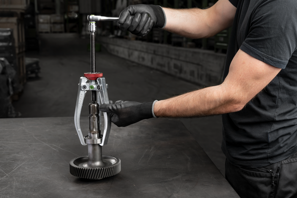 3-ramienny ściągacz z knurem stożkowym został opracowany we współpracy ze skandynawskim producentem łożysk kulkowych do właściwego demontażu łożysk tocznych. Zarówno proporcje ściągacza, jak i jednolicie proste ramiona ściągacza są specjalnie dostosowane do wymagań centralnego odciągania małych i średnich łożysk przy ograniczonych warunkach otoczenia. W ten sposób przeciwdziała się możliwemu uszkodzeniu łożyska i jego gniazda podczas demontażu. Sprężyny gwarantują synchroniczne otwieranie i zamykanie ramion ściągacza, co ułatwia obsługę oraz jeszcze bardziej efektywną pracę. Połączenie naciągniętego pierścienia zaciskowego i elementu sprężynowego zapobiega ześlizgnięciu się ściągacza i tym samym zapewnia wyjątkowo mocne trzymanie w każdej chwili. Jednocześnie utrwalenie ramion za pomocą knura stożkowego przyspiesza i ułatwia pracę przy powtarzających się procesach odciągania o tej samej szerokości mocowania. 3 ramię zapewnia równomierne rozłożenie obciążenia, a tym samym wyjątkowo pewne trzymanie części, którą należy ściągnąć.