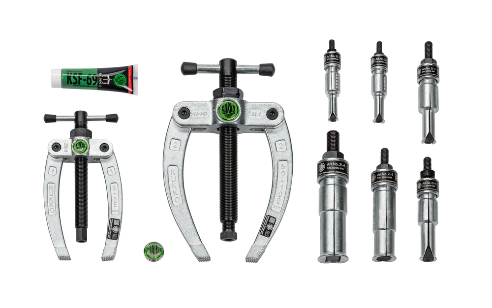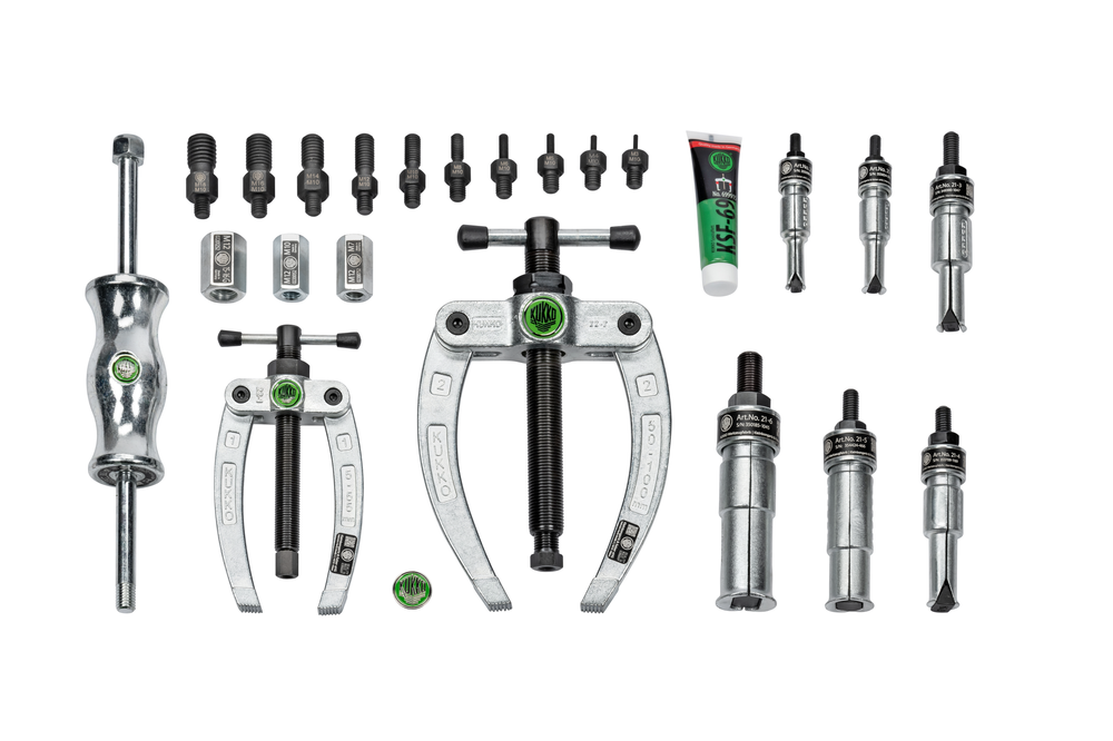 Zestaw młotków ślizgowych 22-częściowy 28-C jest używany do bezdotykowego wyciągania wewnętrznych łożysk, pierścieni zewnętrznych łożysk i tulei, a także części z gwintami (kołki ustalające, wpusty, sworznie itp.) w rzemiośle, warsztacie i przemyśle. Wieloczęściowe wykonanie wewnętrznych ściągaczy z ich wyjątkowo dużymi krawędziami chwytającymi pozwala na bezpieczne wyciąganie wewnętrznych części. Dołączony przeciwwspornik lub młotek ślizgowy są używane razem z wewnętrznymi ściągaczami, w zależności od tego, czy dostępna jest wystarczająca powierzchnia podparcia. Dodatkowo w zestawie znajdują się wkładki gwintowe do wyciągania części z centralnymi otworami gwintowanymi, które są używane razem z młotkiem ślizgowym.