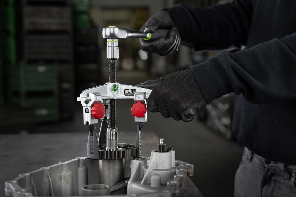Trójramienny ściągacz uniwersalny z wąskimi, szybko regulowanymi hakami ściągacza służy do bezpiecznego i łatwego ściągania łożysk, kół zębatych i tarcz w standardowych rozmiarach dla rzemiosła, warsztatu i przemysłu. Dzięki niemu można zdjąć każdą część zamontowaną na wale i dostępną z zewnątrz. Wąskie haki ściągacza zapewniają dostęp również do ciasnych i trudno dostępnych przestrzeni. Trójramienna konstrukcja gwarantuje równomierne rozłożenie obciążenia i tym samym szczególnie pewny chwyt odciąganej części.